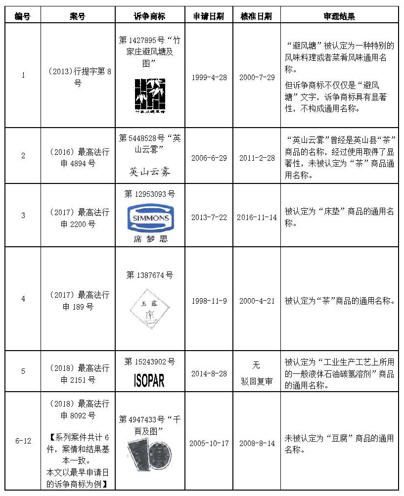 經(jīng)查閱從2015年至今,中國(guó)裁判文書網(wǎng)收錄最高人民法院涉及“通用名稱”商標(biāo)確權(quán)案件的行政裁判文書共計(jì)12份,包括11份行政裁定書和1份行政判決書,裁判作出的時(shí)間是2015年至2019年。筆者以這些文書為研究樣本,分析商標(biāo)確權(quán)中法院認(rèn)定通用名稱的考量因素和裁判標(biāo)準(zhǔn)。
