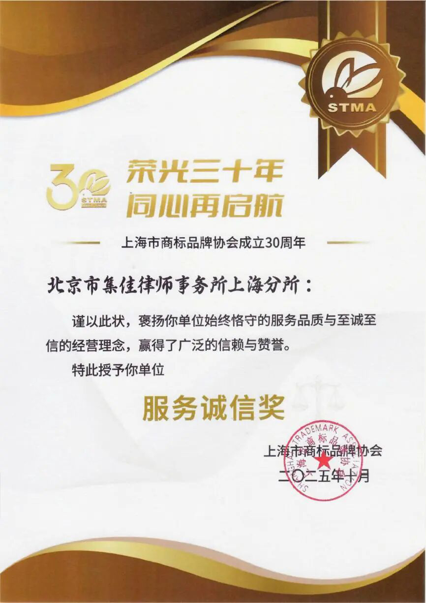 這些榮譽,既是肯定,更是前行的號角。展望未來,集佳上海分所將以此為勵,秉持“客戶至上”的初心,在專業領域深耕不輟,持續深化專業知識,優化服務流程與體驗。我們期待與上海市商標品牌協會、業界同仁及所有信任我們的客戶攜手同行,共同推動中國商標品牌事業邁向更加繁榮的明天。