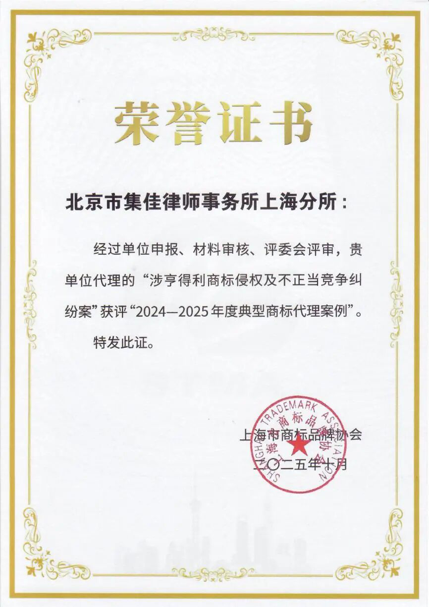 ★ 集佳上海分所辦理的“‘利得亨’商標異議案”獲評“2024-2025年度典型商標代理案例提名”